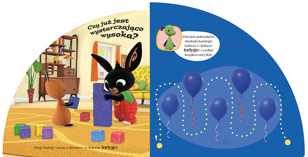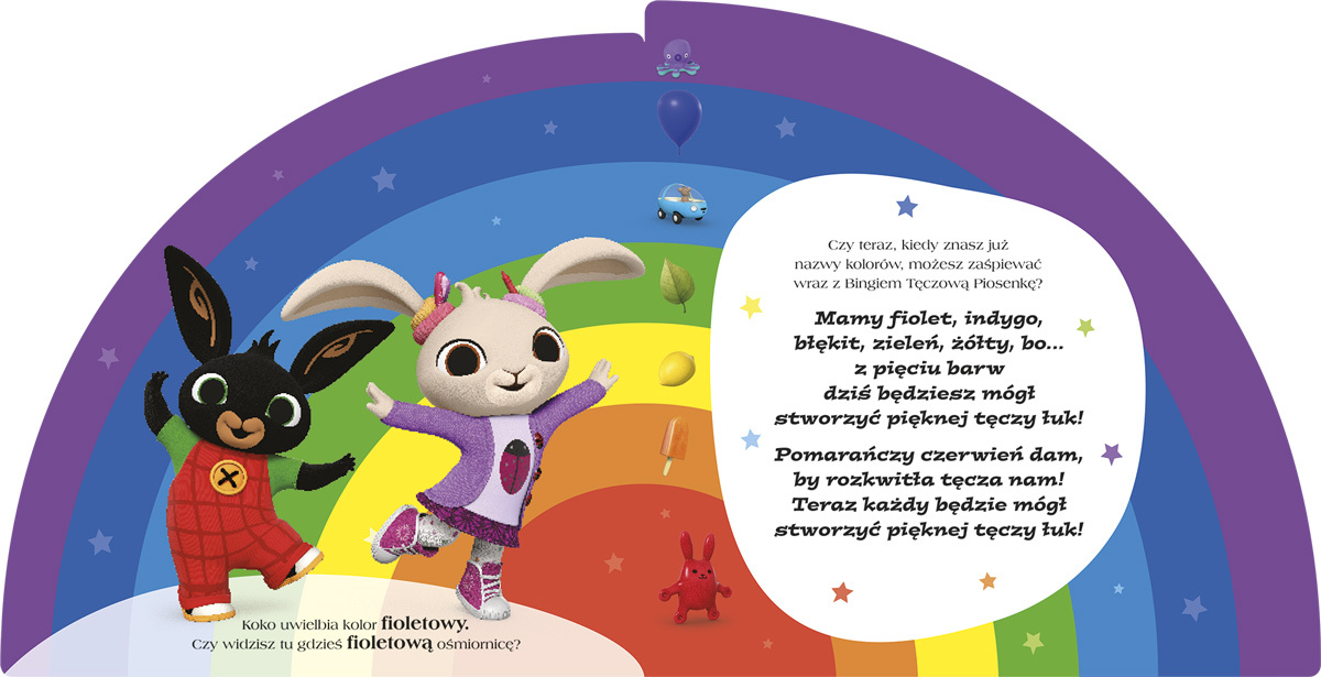 Książka zawiera elementy aktywizujące – dziecko może śledzić palcem kształty i linie, co rozwija jego motorykę małą oraz pomaga w skupieniu uwagi. Całość dopełnia tekst jednej z najpopularniejszych piosenek znanych fanom Binga – oczywiście o kolorach tęczy! Zaokrąglone rogi i poręczny format sprawiają, że książeczka idealnie leży w małych rączkach i jest bezpieczna nawet dla najmłodszych czytelników.