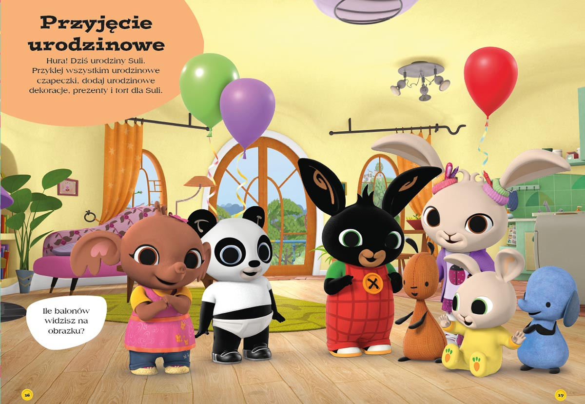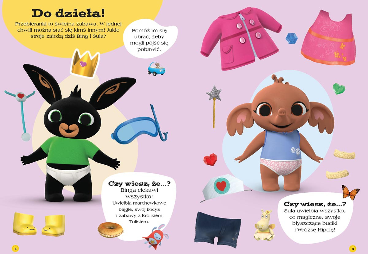 Przebieranki to świetna zabawa! Dzięki tej książce z naklejkami twoje dziecko dołączy do Binga, Suli i ich przyjaciół, by wspólnie przeżywać niezwykłe przygody. Wystarczy użyć dołączonych do książki naklejek, by przebrać bohaterów w najróżniejsze stroje. Kim dzisiaj będą Bing i Sula? Może Supermagicznym Królem Lwem i Królową Wróżek? A może odważnymi pielęgniarzami, którzy opiekują się Królisiem Tulisiem? A może potrzebują ochraniaczy na uszy, by spokojnie oglądać pokaz fajerwerków?