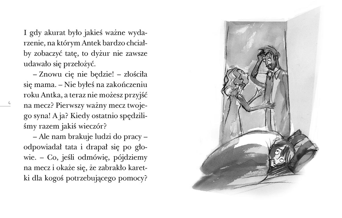 Antek uwielbia grać w piłkę nożną i cieszy się z sukcesów swojej drużyny. Często gra mecze wyjazdowe i bardzo by chciał, żeby podczas takich wydarzeń kibicowali mu rodzice. Niestety tak nie jest. Tata Antka pracuje jako ratownik medyczny i ma bardzo mało czasu. Nie jedzie też na ważny mecz drużyny Antka, co w chłopcu budzi złość i rozczarowanie. Jednak kiedy w drodze powrotnej dochodzi do wypadku autobusu z młodymi piłkarzami, Antek jako jedyny nie traci zimnej krwi. Dzięki wskazówkom, jakich udzielił mu tata, chłopiec dowodzi akcją w oczekiwaniu na przyjazd służb ratowniczych. „Karetka mojego taty” to opowieść o pasji do sportu, relacjach między synem a tatą, a także o tym, jak ważna i potrzebna jest praca ratowników medycznych.