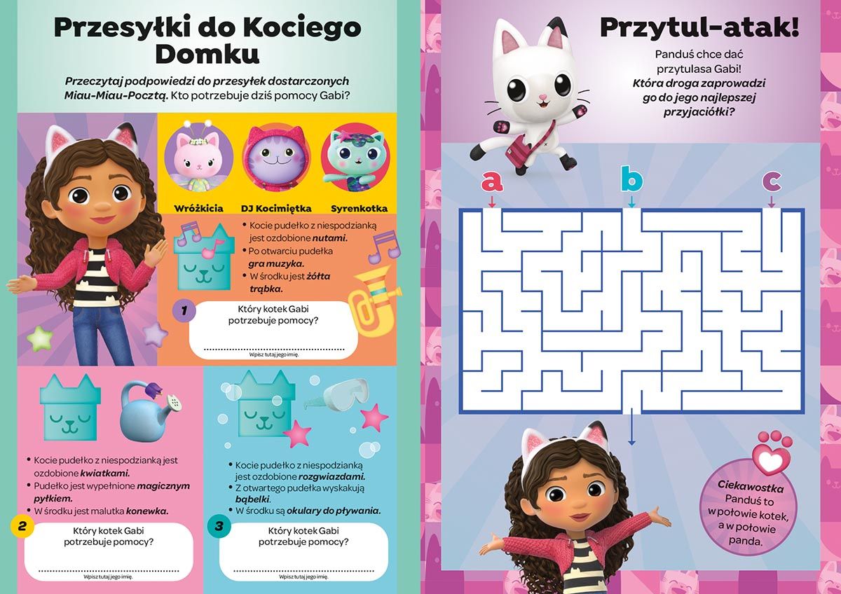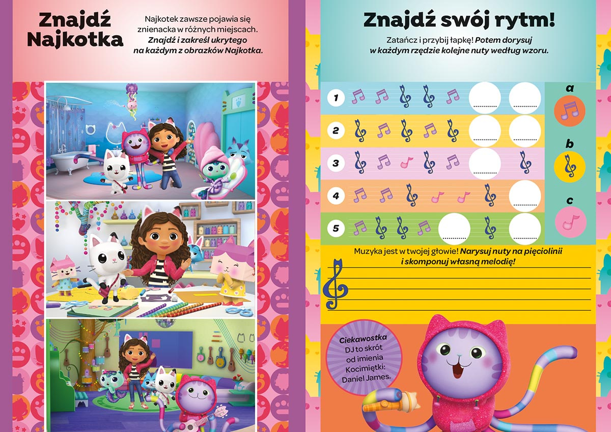 Koci Domek Gabi. Rysuję i ścieram to książka, z której można korzystać bez końca. Znalazły się tu zadania, zabawy i łamigłówki, które rozwiążesz za pomocą dołączonego do okładki mazaka. Jeśli zauważysz błąd lub chcesz zrobić zadanie jeszcze raz, wystarczy zetrzeć stronę i zacząć od nowa! To dobra zabawa, a jednocześnie sposób na to, by z książki mogło korzystać kolejno kilka osób. Pora więc przenieść się do Kociego Domku Gabi i dać się porwać labiryntom, odszukać Najkotka, który lubi ukrywać się w zaskakujących miejscach, skomponować własną melodię i zapisać ją na pięciolinii i sprawdzić, do którego pomieszczenia zabierze przyjaciół Kicifura!