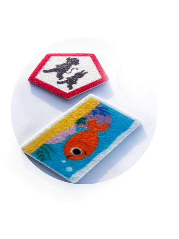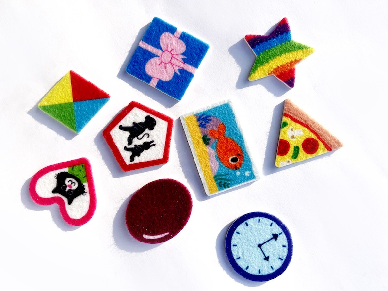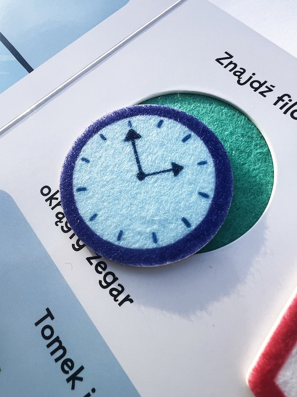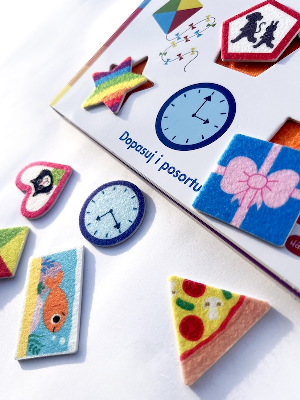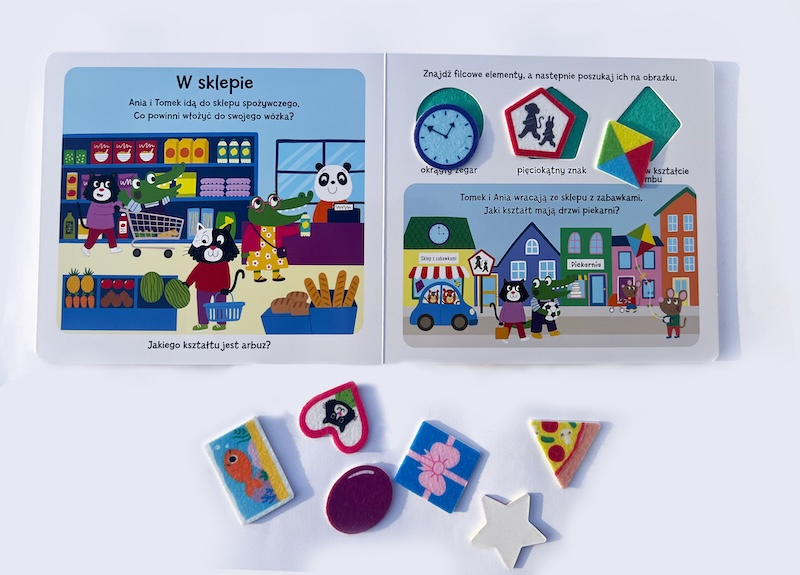 Ta interaktywna kartonowa książeczka została zaprojektowana, aby w ciekawy i innowacyjny sposób uczyć maluchy podstawowych pojęć. Na każdej rozkładówce przedstawiony jest inny kształt, a zadaniem dziecka jest znalezienie odpowiedniego elementu i umieszczenie go na stronie z filcową tablicą. Do zabawy zachęcają barwne postacie zwierząt: krokodyl, tygryski, żyrafa, mysz i kotek. Dodatkowo okładka książki rozkłada się w bramkę z sorterem kształtów, gdzie dzieci mogą dopasowywać swoje filcowe elementy po ukończeniu książeczki.