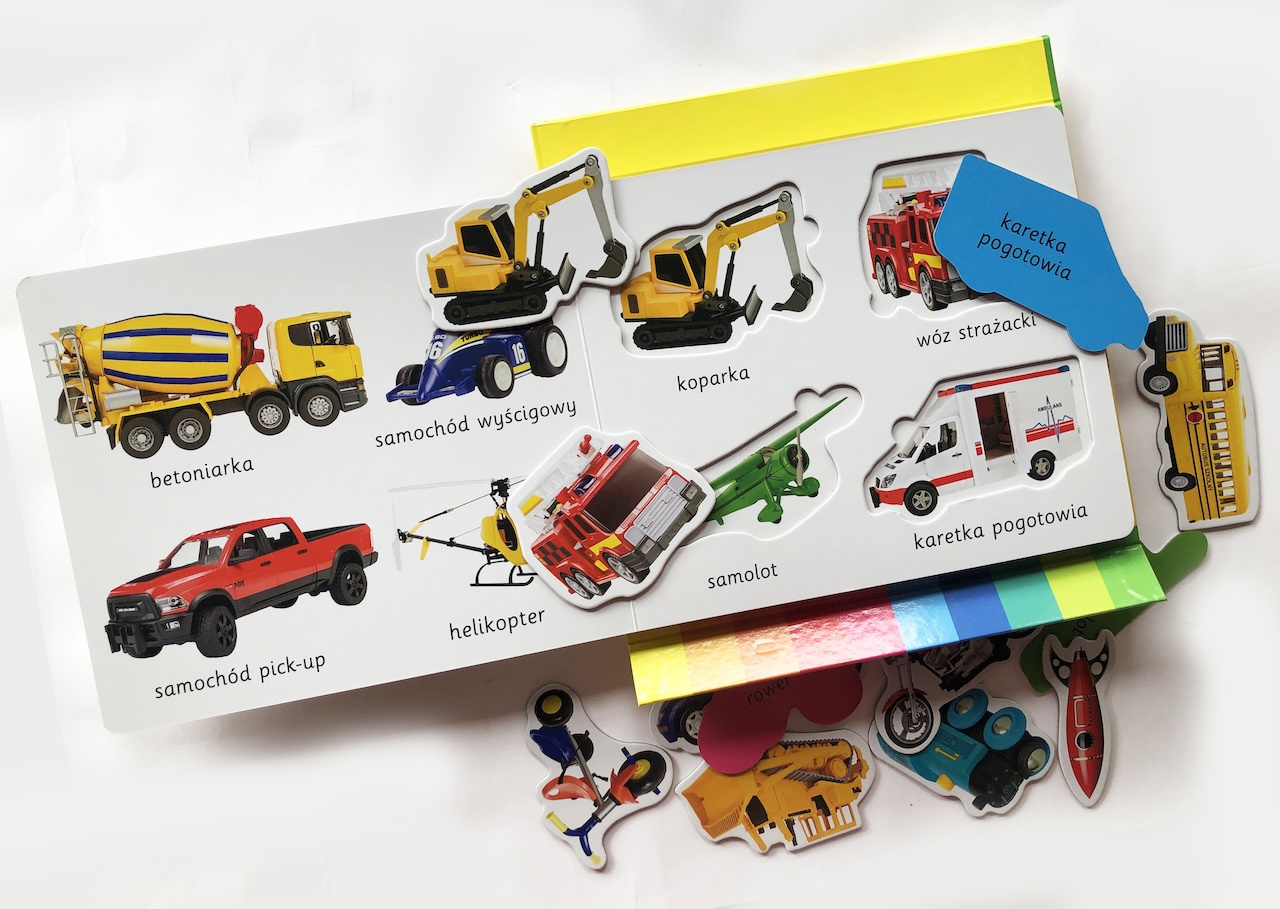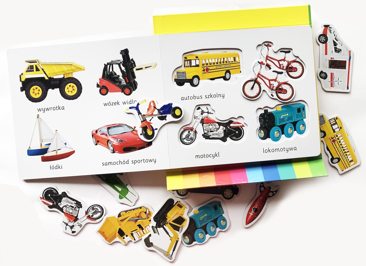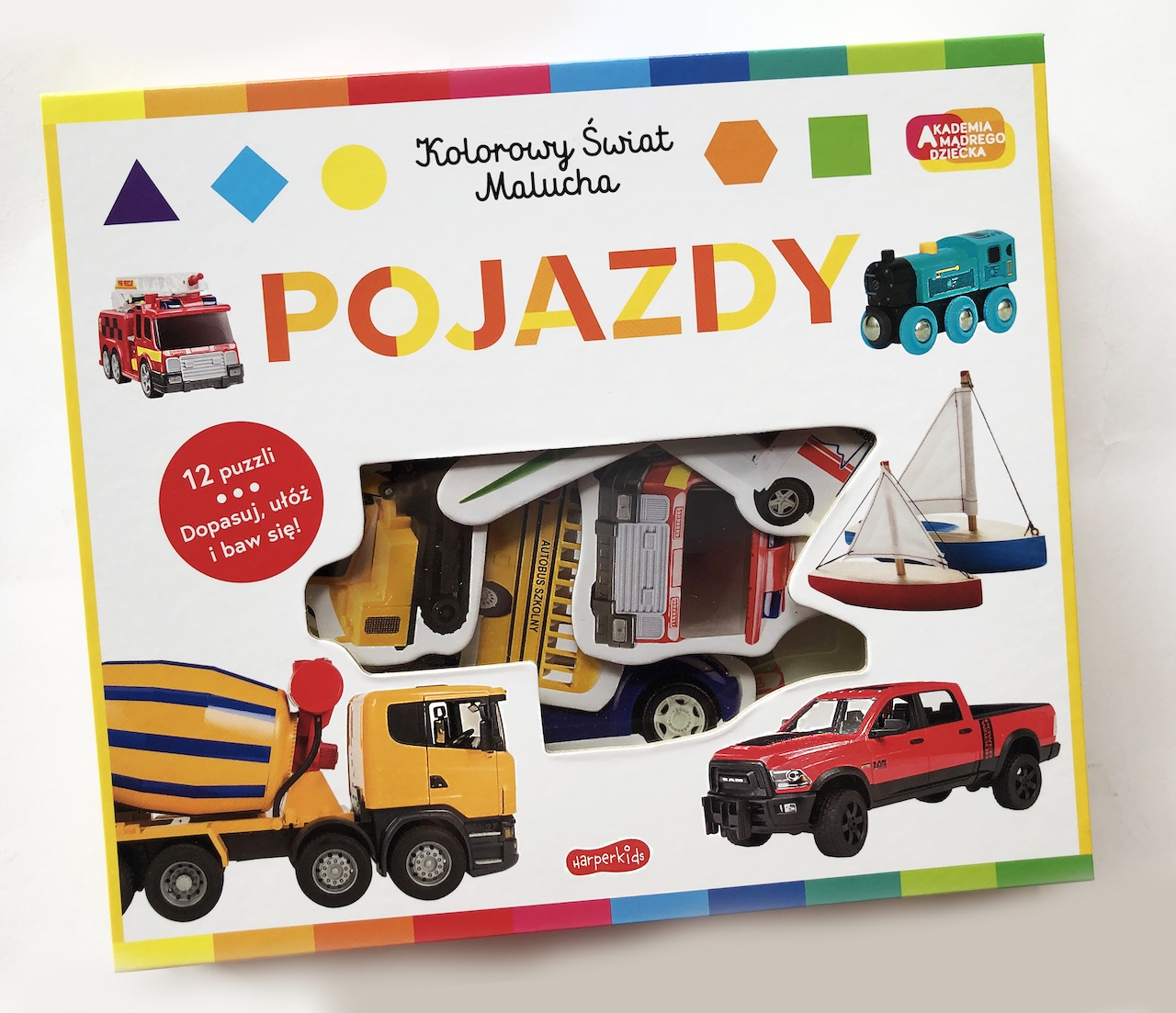 Kolorowy świat malucha. Pojazdy to zupełnie nowy zestaw edukacyjny który zachwyci małych i dużych! Zestaw zawiera kolorową książeczkę z kartonowymi stronami oraz barwnymi, przyciągającymi uwagę fotografiami, oraz 12 dużych, kartonowych puzzli, które można wygodnie przechowywać w dedykowanej kieszeni. Wytrzymałe elementy układanki nie tylko sprawiają frajdę, ale są też idealne dla małych rączek, wspierając rozwój motoryki małej i koordynacji. Każde udane dopasowanie to nie tylko radość, ale mały sukces, który buduje pewność siebie i zachęca do dalszego odkrywania świata.